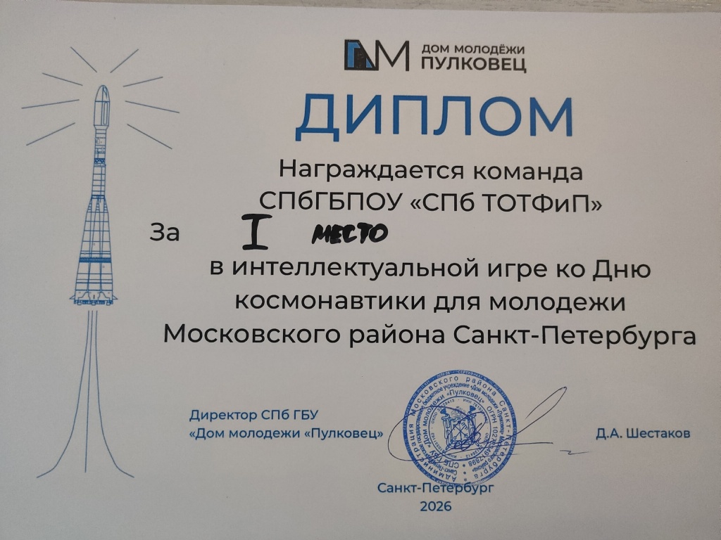 14 апреля команда студентов ТОТФиП приняла участие в районной интеллектуальной игре ко Дню космонавтики в Доме молодежи "Пулковец"