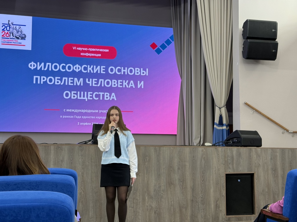 2 апреля 2026 года в нашем техникуме с успехом прошла VI Научно-практическая конференция с международным участием «Философские основы проблем человека и общества», приуроченная к Году единения народов России. Конференцию открыл заместитель директора техникума по учебной работе, доктор социологических наук, профессор Костин Роман Алексеевич, обратившийся к участникам с приветственным словом, в котором отметил актуальность философских вопросов в современном мире и выразил уверенность в том, что конференция станет площадкой для поиска ответов на вызовы времени. С воодушевляющим докладом на пленарном заседании выступил заведующий учебным отделением, кандидат культурологии, доцент Фролов Андрей Вячеславович, зарядив аудиторию энергией для дальнейшей работы и задав тон для дальнейших дискуссий.